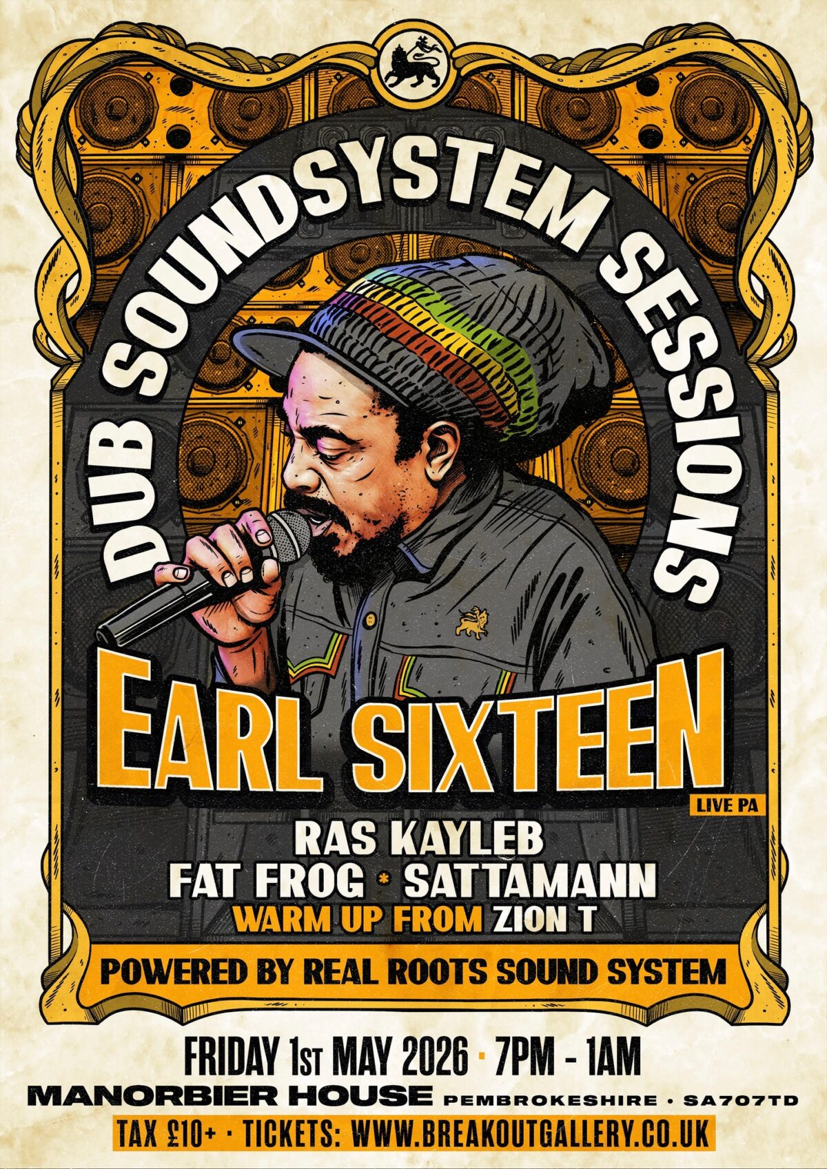 Another full moon gathering in the beautiful village of Manorbier in the fantastic Manorbier House. Run come rally for a night of higher, rootikal vibrations and heavy weight bass pressure, powered by the hand-built, fully analogue, Real Roots Sound System with live singers and MCs Strictly vinyl, strictly roots, dub, U.K. roots, steppas all night long with live vocalists and a live PA set from Jamaican veteran EARL SIXTEEN!!!! Don’t miss this chance to catch this foundation roots reggae singer live and direct in full sound system style live in the intimate venue of Manorbier House. Reggae legend MC, Ras Kayleb (of Channel One Sound System for 20+ years) freestyling. Also from London joining Sattamann is selector & producer Fat Frog of PurpleFade Records. Warm up comes from local up and coming selector Zion T outta Tenby. Powered by: Real Roots Sound System 1/2 stack Friday 1st May 2026 7pm-1am Manorbier House, Pembrokeshire SA707TD £10.00 Super Earl Bird NOW SOLD OUT £14.40 Early Bird NOW SOLD OUT £17.50 NOW SOLD OUT £20.00 Main Release £25.00 Final Release NO BOOKING FEES! LIMITED CAPACITY! TRAVEL: Manorbier Train Station ACCOMMODATION: Lots in Manorbier including a hostel for £30 a night, lots of camping and van areas locally too. Tenby is just down the road great for a weekend break. Brought to you by Breakout Gallery & Real Roots events. Part of Real Roots Sound System’s & Breakout Gallery’s 10th birthday year 2016-2026 EARL 16 Earl Sixteen born 1958 in Kingston, Jamaica, is a legendary roots reggae singer whose career began in the mid-1970s. Known for his work with producers like Lee “Scratch” Perry and Studio One, he gained fame for hits like “Malcolm X” and as a vocalist for Dreadzone and Leftfield. One of the most prolific U.K. roots recording artists. RAS KAYLEB Now a veteran, MC Ras Kayleb