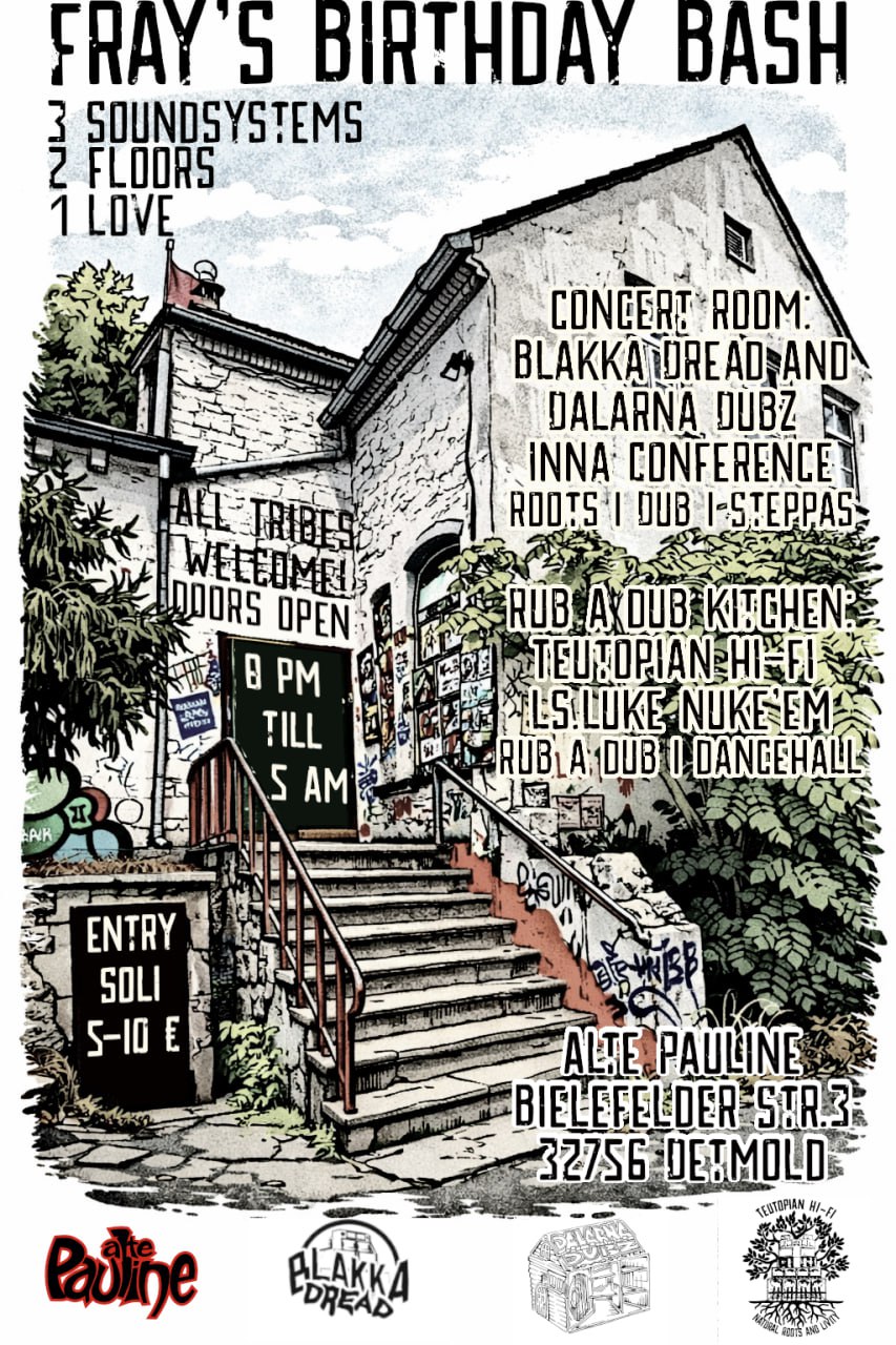 On the 20th, we're celebrating Fraylo's Earthday at Alte Pauline in Detmold. 🎉 On the main floor, Blakka Dread Soundsystem & Dalarna Dubz Soundsystem will be spinning conference-style roots, dub, and steppas. 🔊 In the Rub A Dub Kitchen, Luke Nuk'em & Teutopian Hi-Fi will be heating things up with rub a dub, digital, and dancehall. 🔊 Doors open at 8 pm. Entry: €5-10 (solidarity). Alte Pauline, Bielefelder Str. 3, 32756 Detmold.